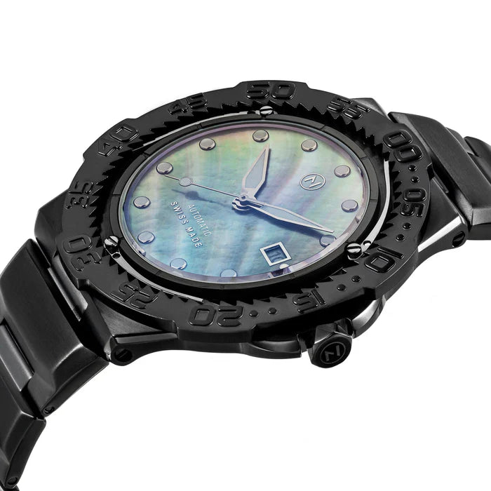 We carefully designed every piece of the TRIDENT AUTOMATIC dive watches to fit perfectly into our slim Trident case, without increasing its size. The updated dial and case is now set with Double Curved Sapphire Crystal, creating high visibility and durability that is equivalent to its stunning look. We've also updated the dial itself, using the highest grade of Tahitian Mother of Pearl, which can take up to two years to mature and obtain from an oyster shell. This beautifully reflective material was carefully manufactured and quality controlled to best suit our standards of luxury, durability, and functionality.