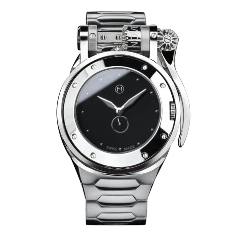 Just like identical twins who are genetically matched but have different fingerprints, so too Gemini has one design but two distinct colours. Presented in an elegant matte black dial within a polished steel bezel, this is a professional timepiece. Elegant, sophisticated and fearless on one side and then lift the streamline handle to reveal Gemini’s adventurous, sporty side.